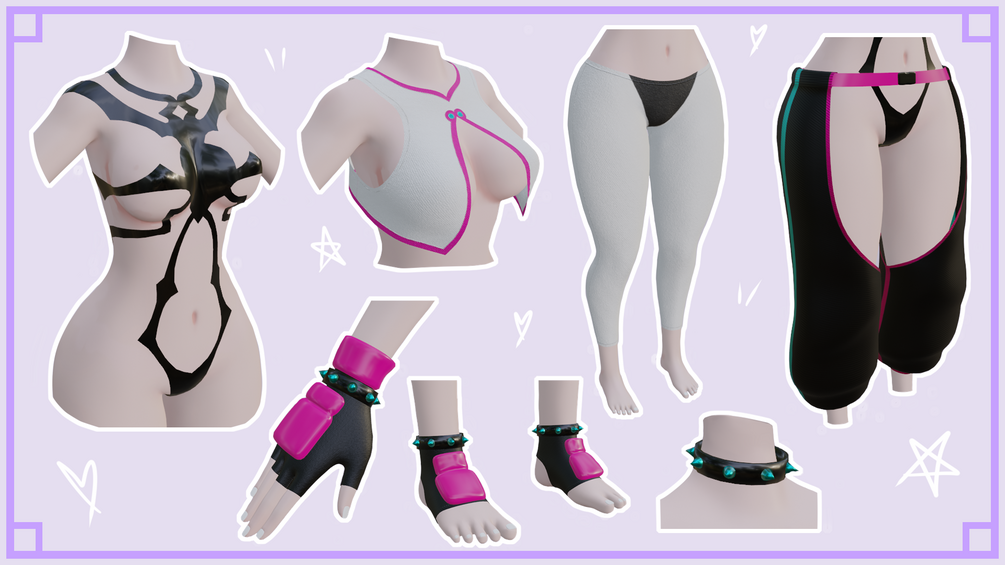 - Individual Items include: Bodysuit, Jacket, Leggings, Chaps, Gloves, Shoes and a Choker